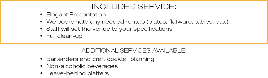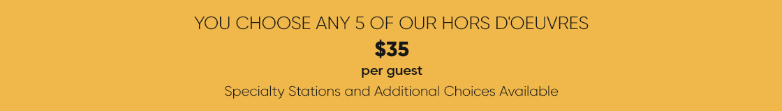 $40 per guest(Minimum 15 guest) Includes any 5 selections Additional choices, $5 & $7 Menu includes 2 pieces per person per item